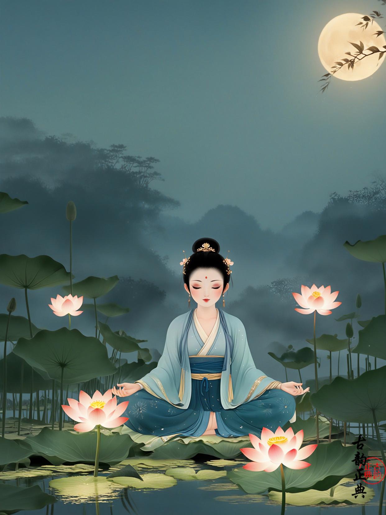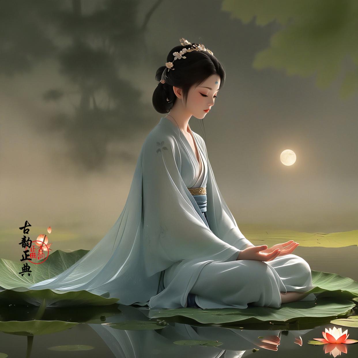 一位温婉的女子,静坐于荷塘边,她的内心如同那平静的水面,波澜不惊,这便是“静”的写照。道家讲究内心的平和与宁静,而“静”正是这一理念的诠释。
