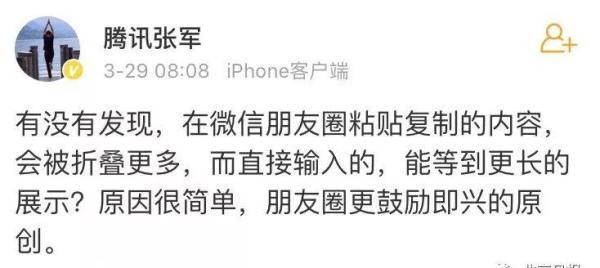 3月29日,腾讯公关张军在个人微博回应称,“原因很简单,朋友圈更鼓励即兴的原创。”
