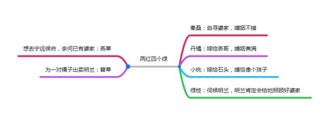 对于明兰来说,小桃是她最倒霉时的意外奖,丹橘是她前途未明时的鼓励奖,情分自然也是不同的。而丹橘、小桃加上后来四个绿的,六个大丫鬟,其中的五个都有很好的姻缘,唯有一个却掉了队!