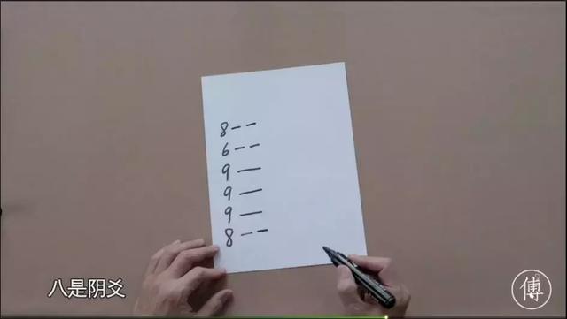 4 经过以上三次运算得到初爻,知其为阴爻或阳爻,并且记下数字(九或八或七或六)。