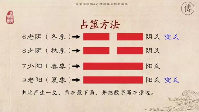 3 最后留在桌上的余数以四除之,得到九或八或七或六。九与七为阳爻,八与六为阴爻。